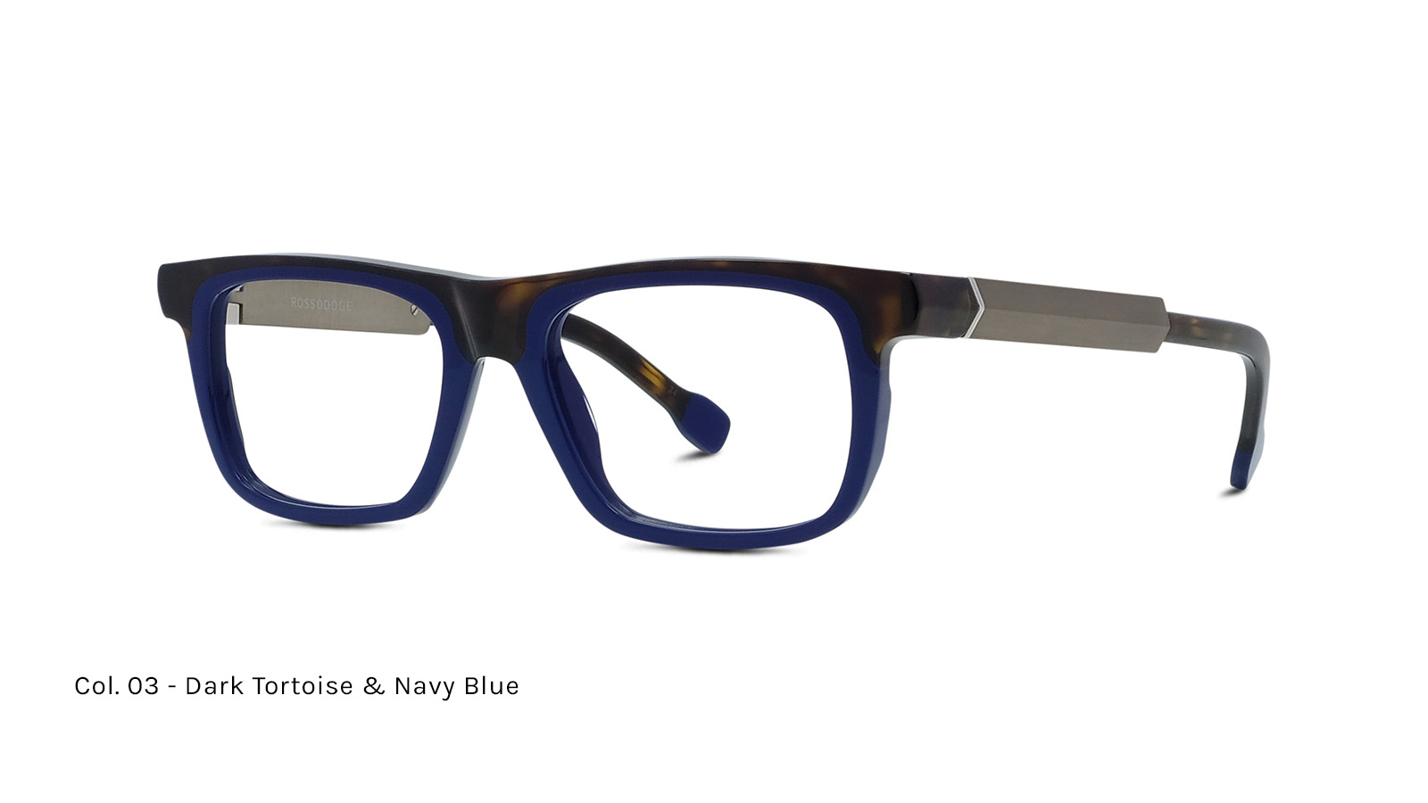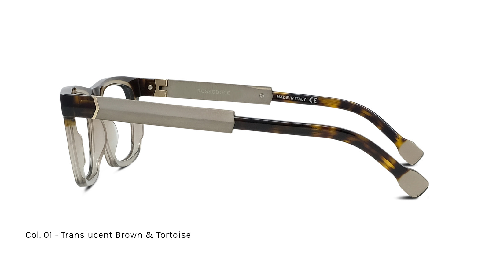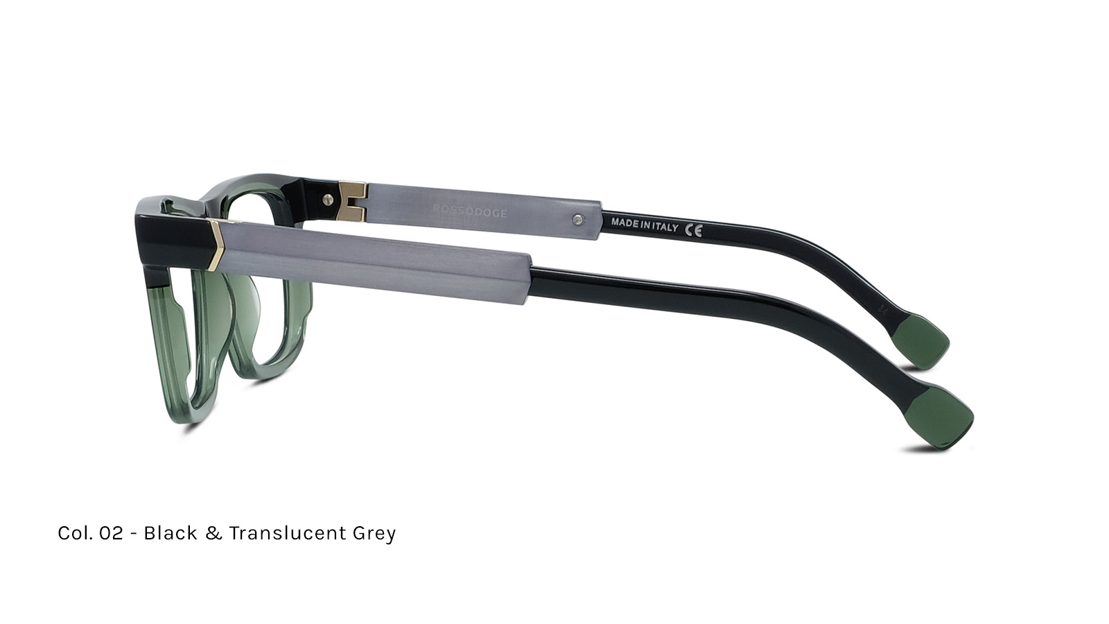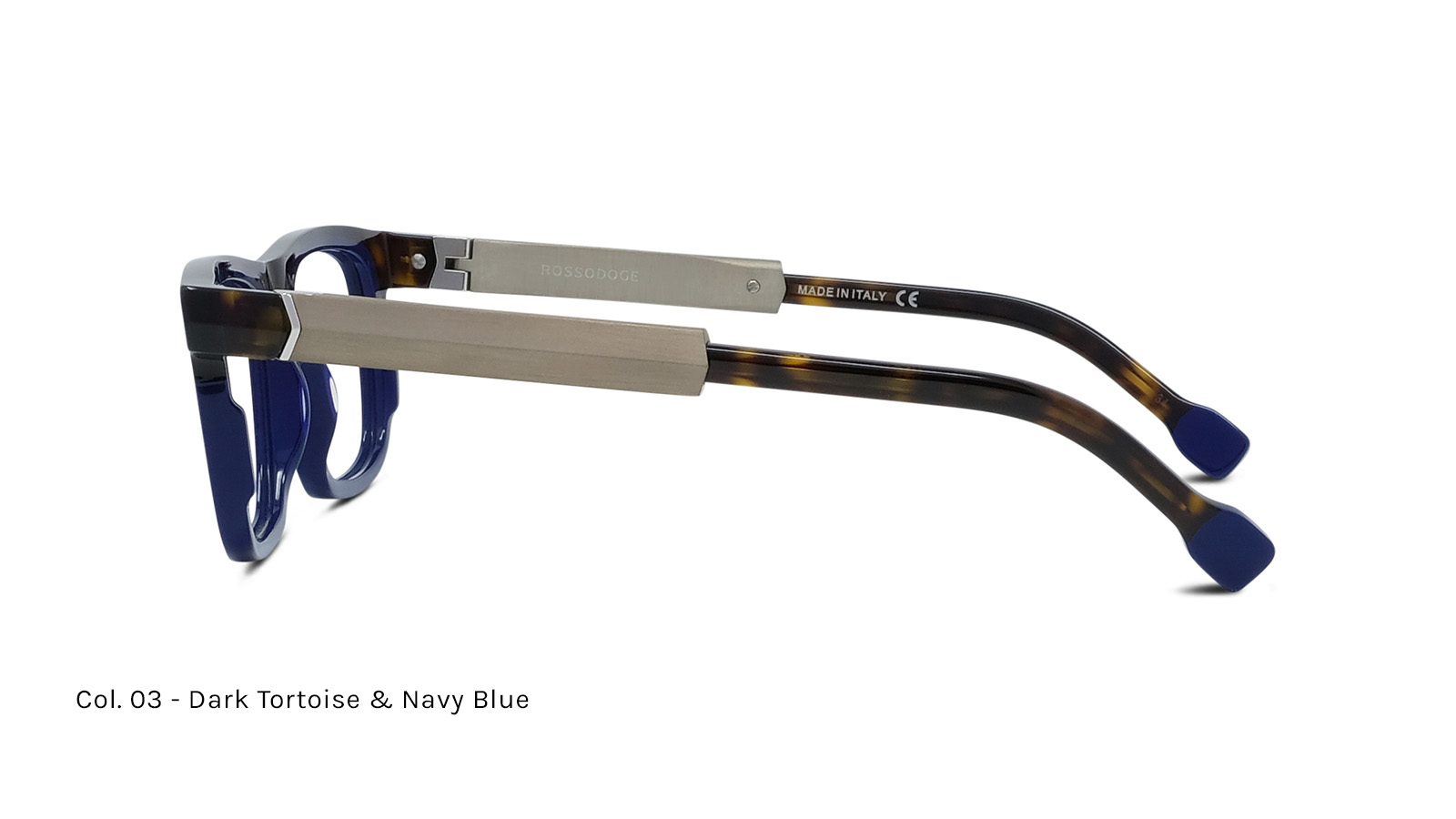 Acetate lamination in different colors on the front and temples, with a steel core, aluminum detail on the temple, and a brass nose piece. Temples featuring an Ergal 7075 aluminum element with a satin anodized finish, making it lighter and more durable.