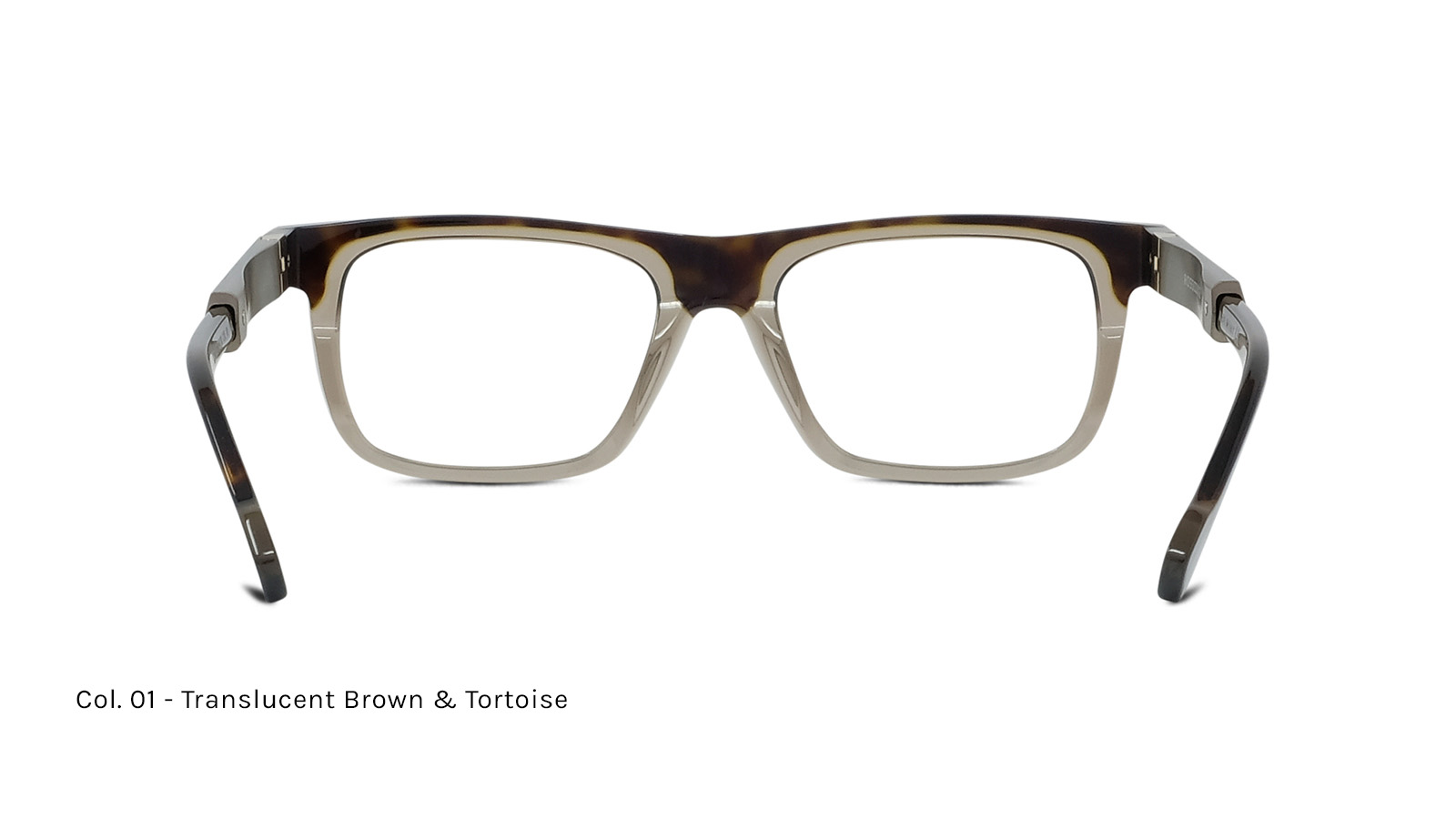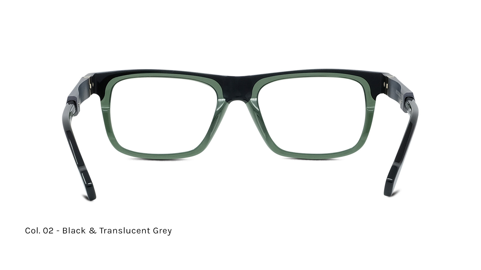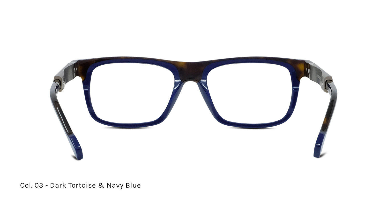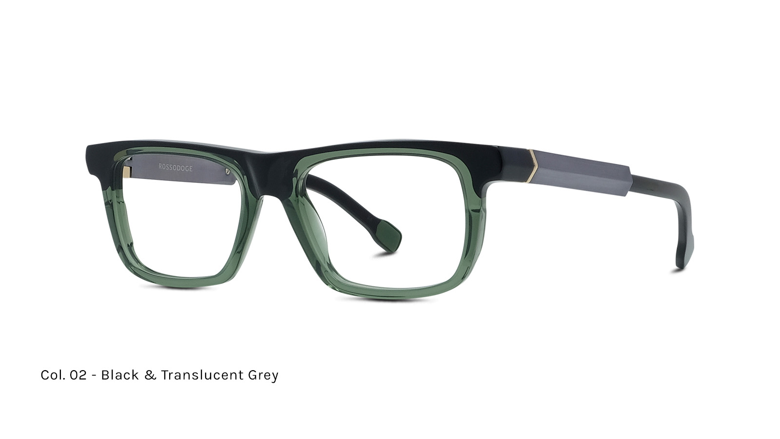 Acetate lamination in different colors on the front and temples, with a steel core, aluminum detail on the temple, and a brass nose piece. Temples featuring an Ergal 7075 aluminum element with a satin anodized finish, making it lighter and more durable.