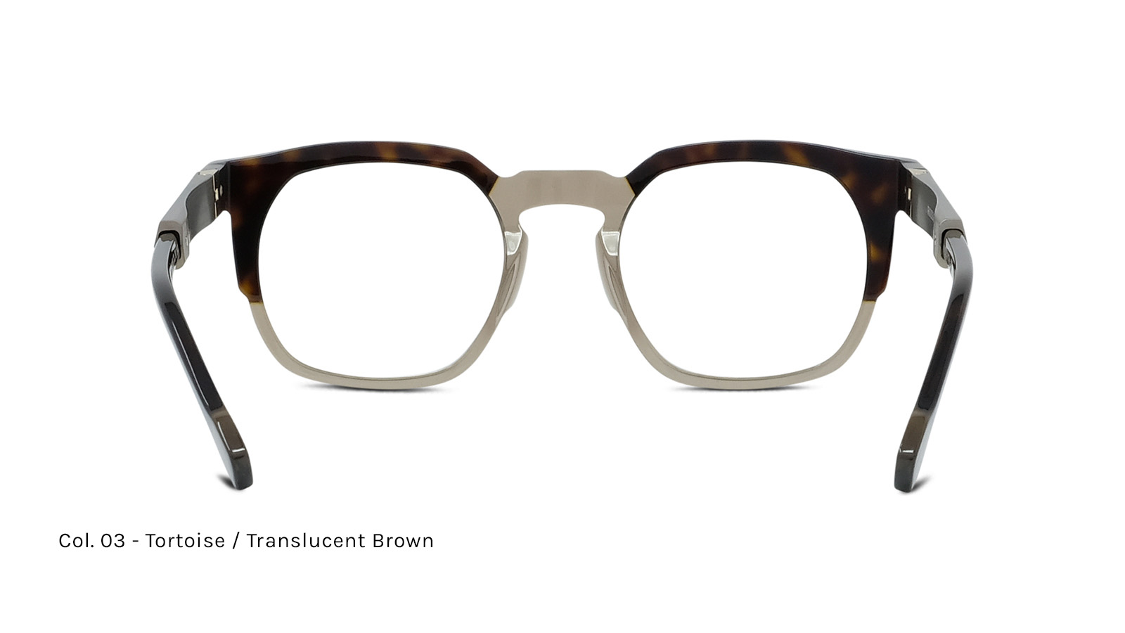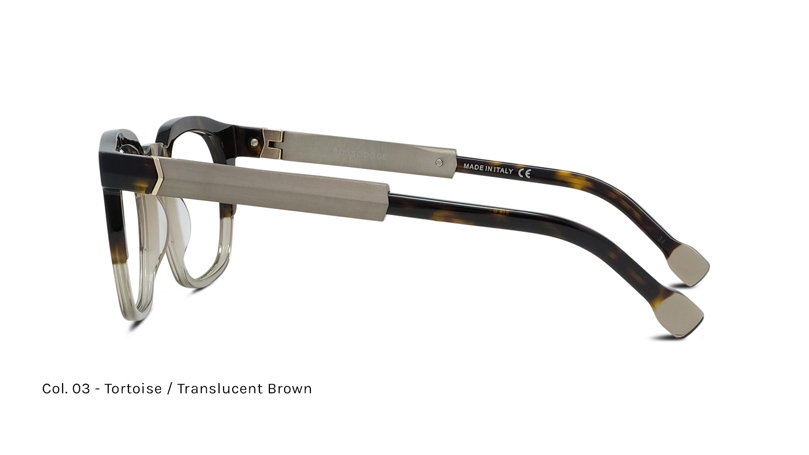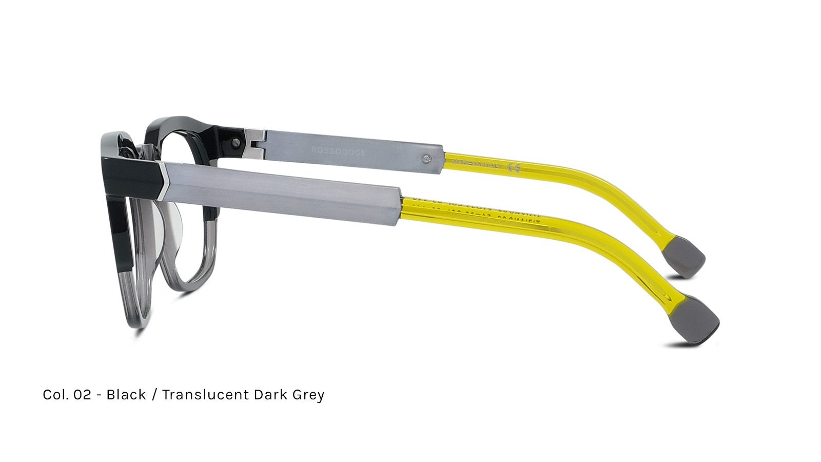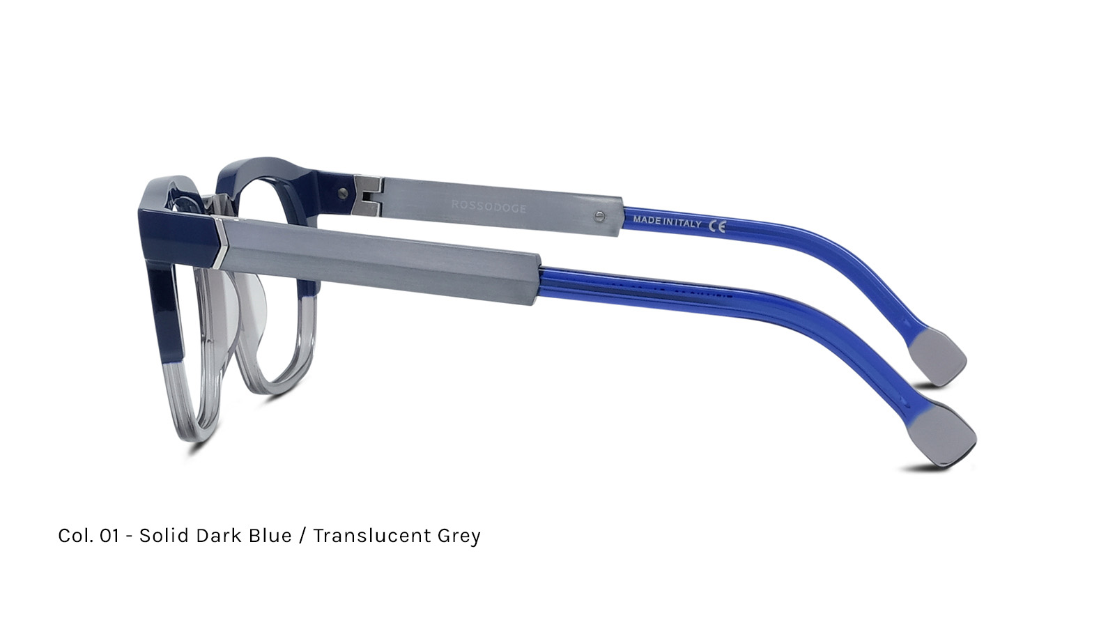 Acetate lamination in different colors on the front and temples, with a steel core, aluminum detail on the temple, and a brass nose piece. Temples featuring an Ergal 7075 aluminum element with a satin anodized finish, making it lighter and more durable.