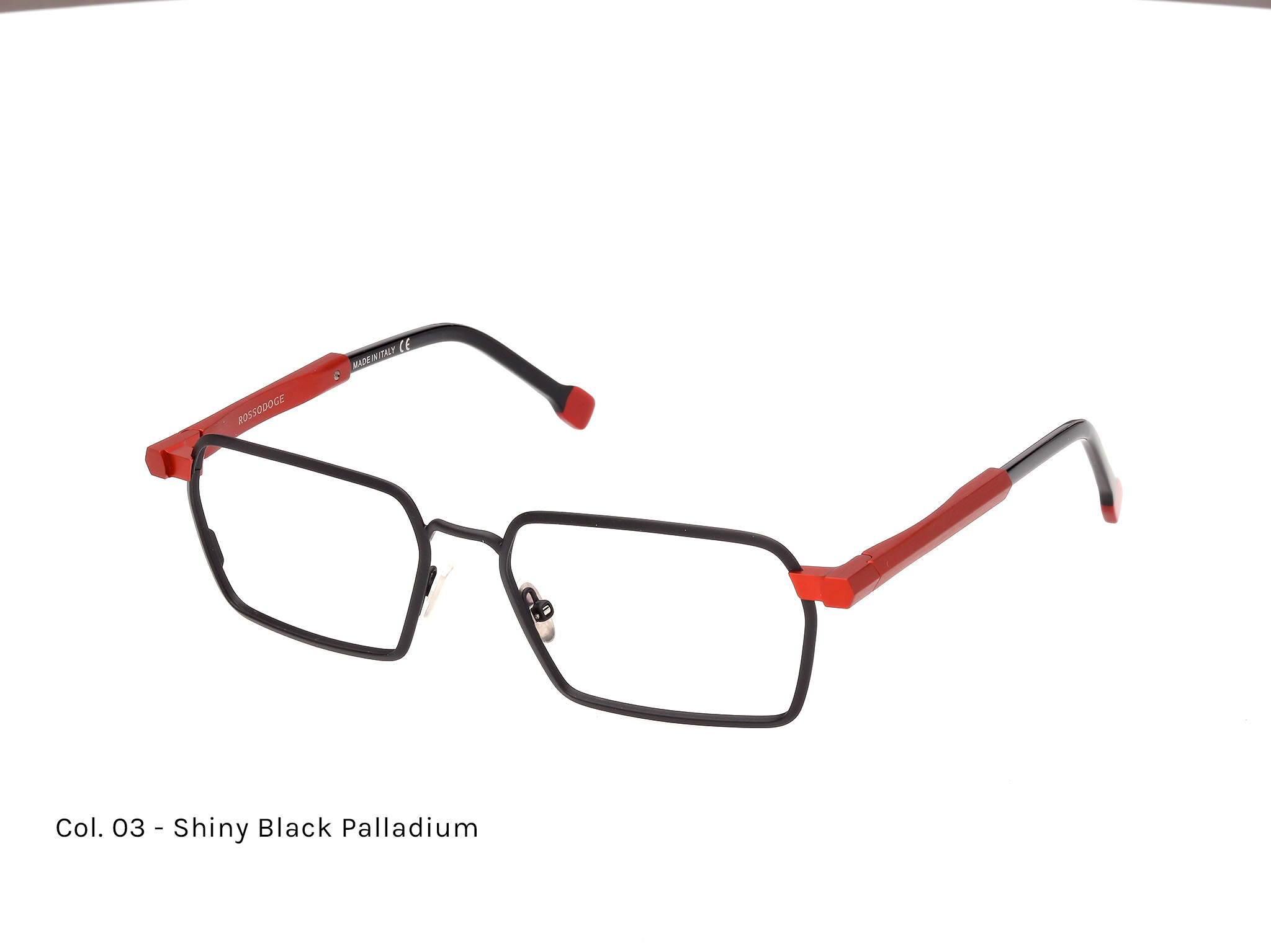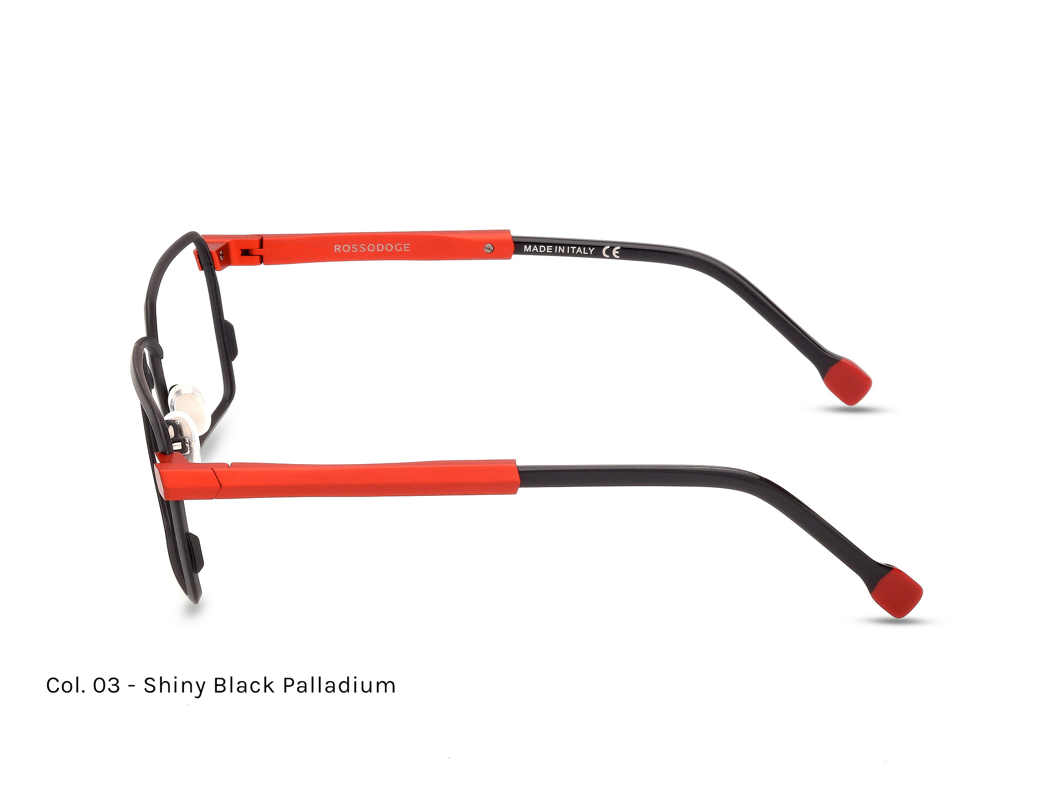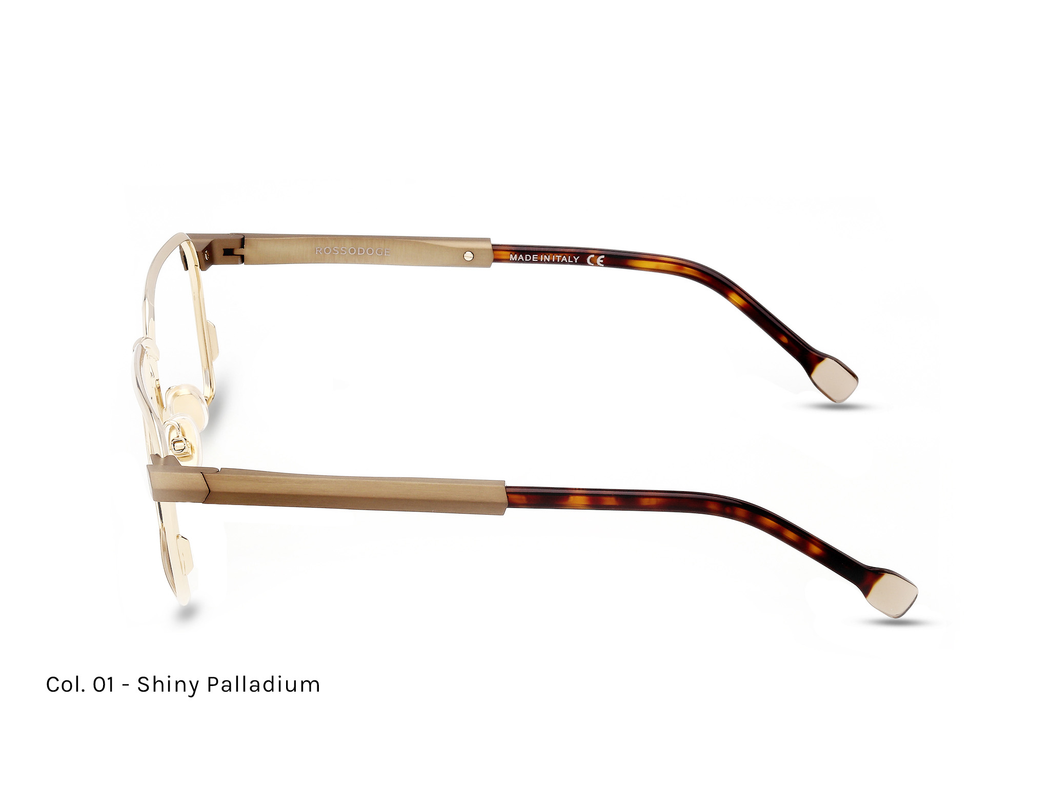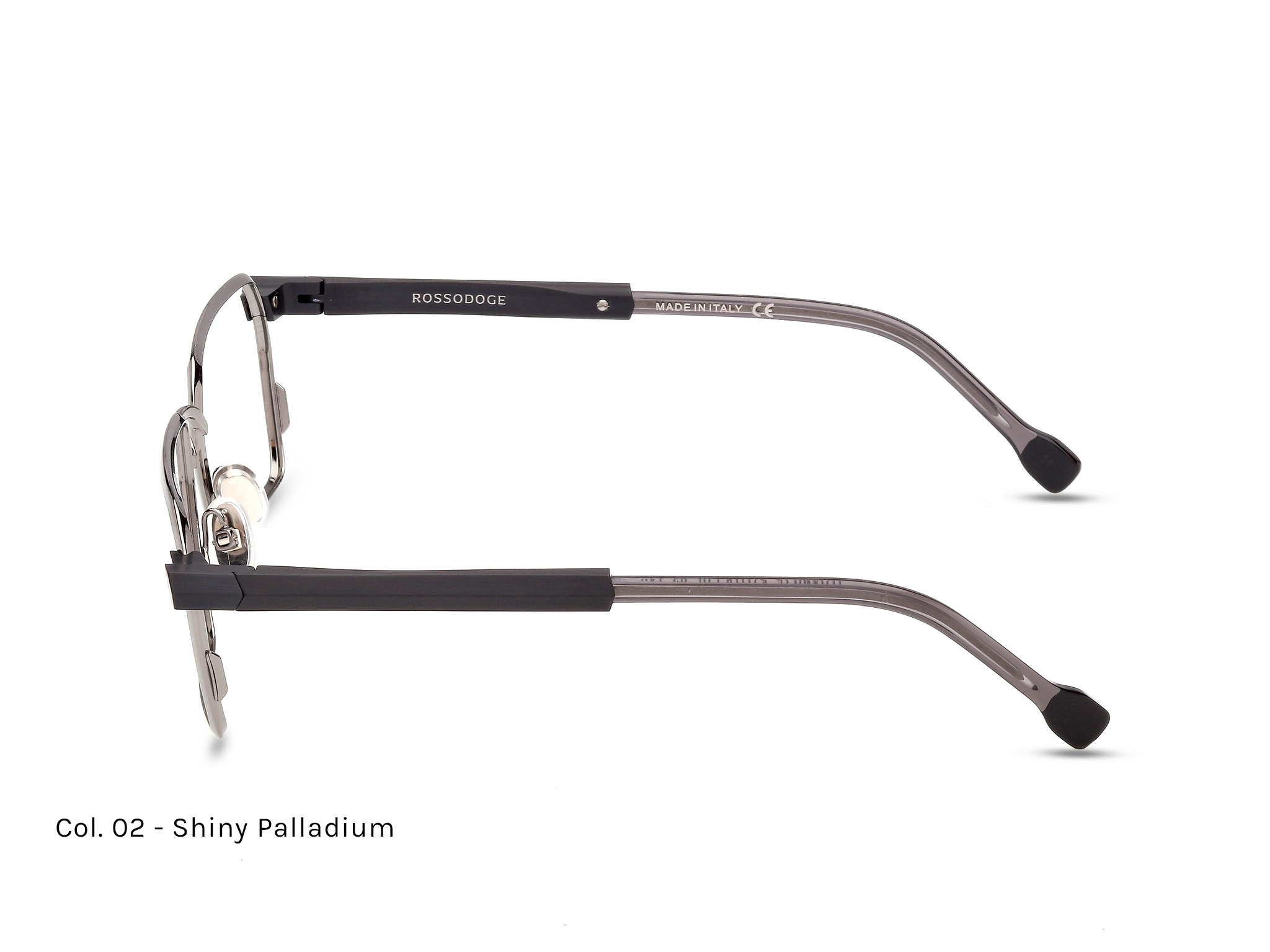 Frontale in metallo, aste con acetato laminato bicolore, musetto in alluminio, anima in acciaio. Aste e musetto con elemento in alluminio Ergal 7075 con finitura anodica satinata, più leggero e resistente.