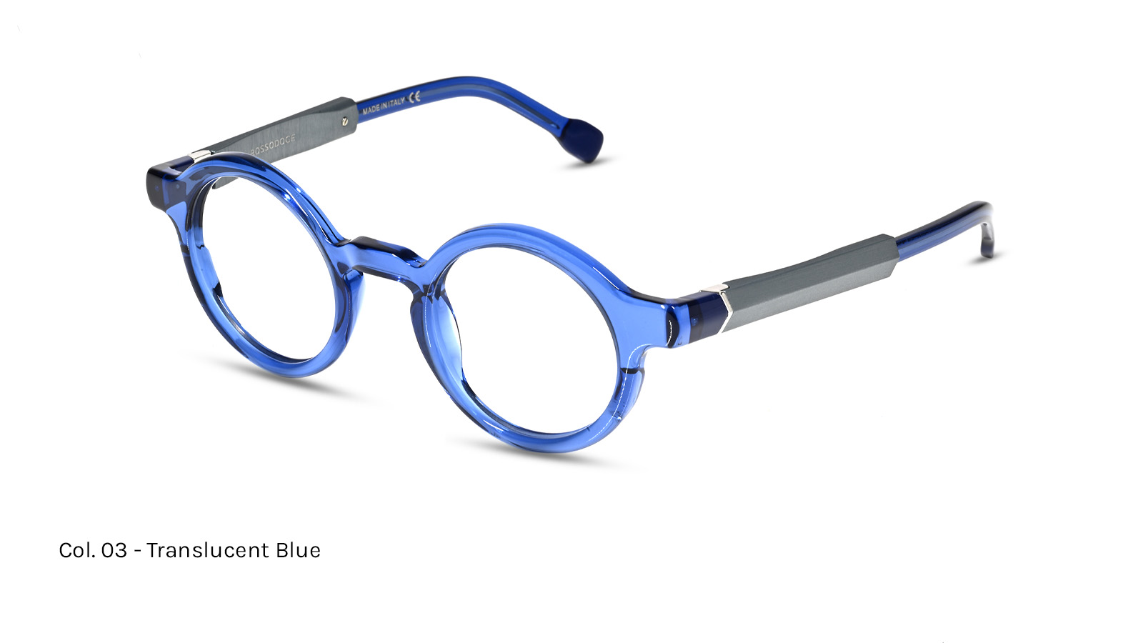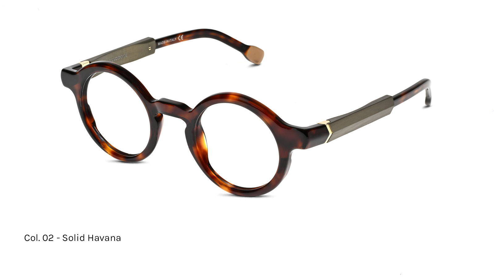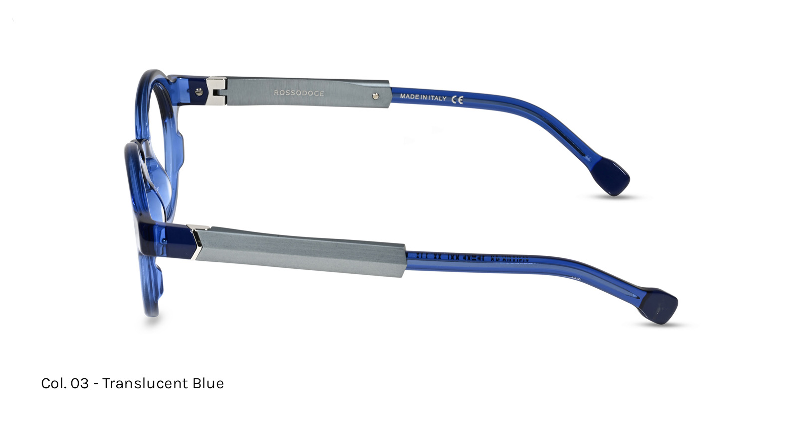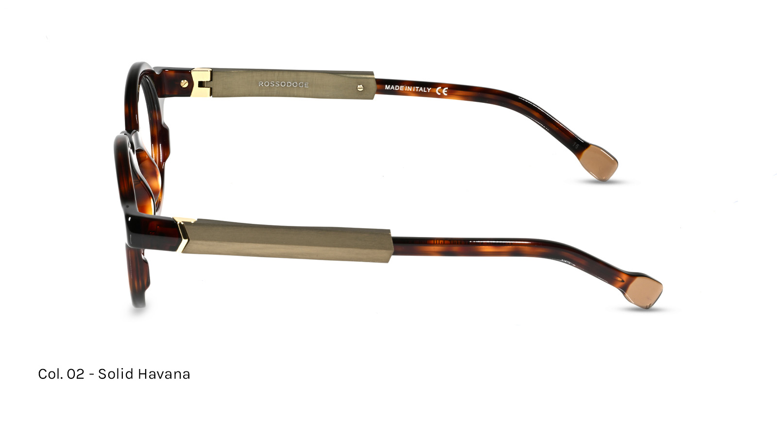 Acetate lamination in different colors on the front and temples, with a steel core, aluminum detail on the temple, and a brass nose piece. Temples featuring an Ergal 7075 aluminum element with a satin anodized finish, making it lighter and more durable.