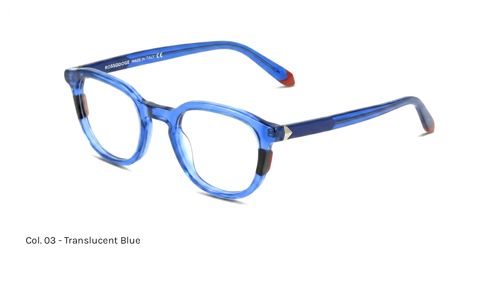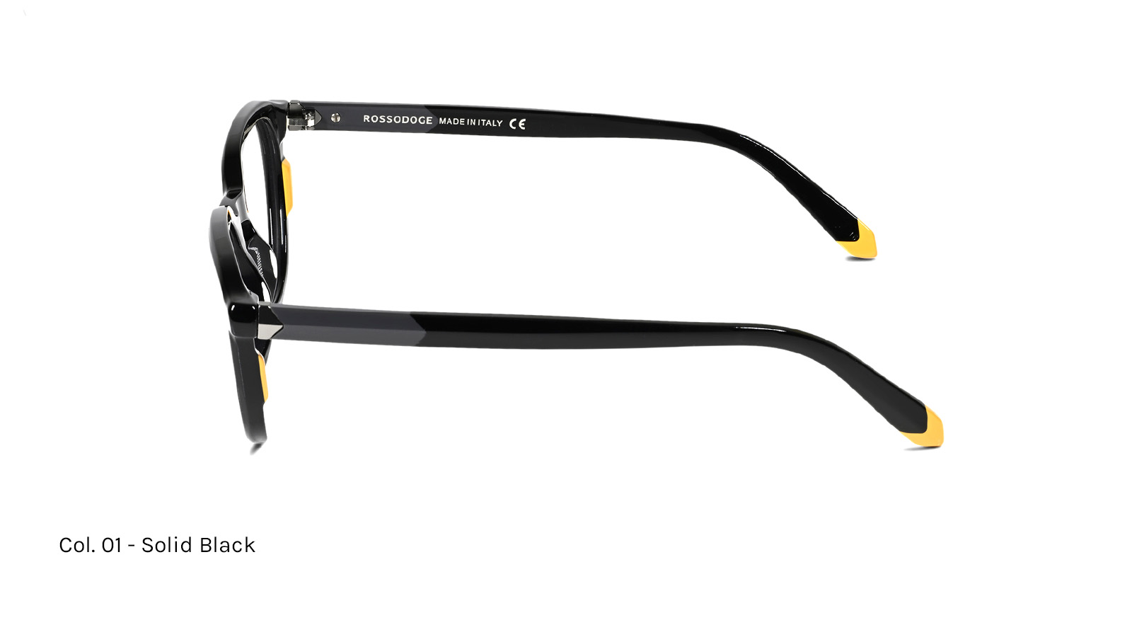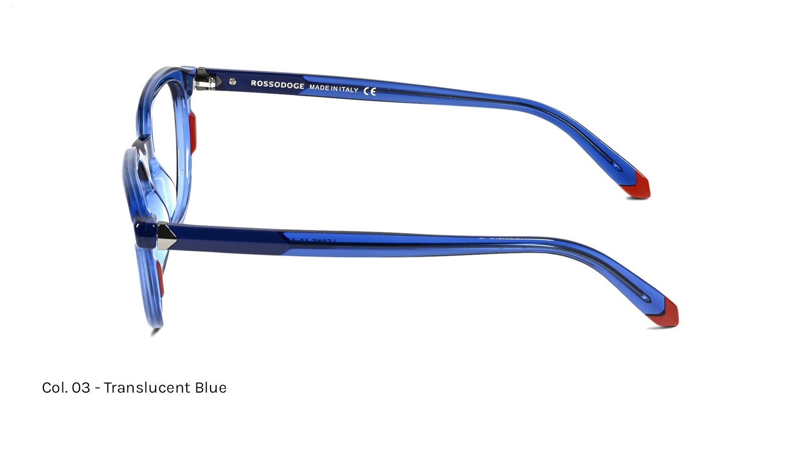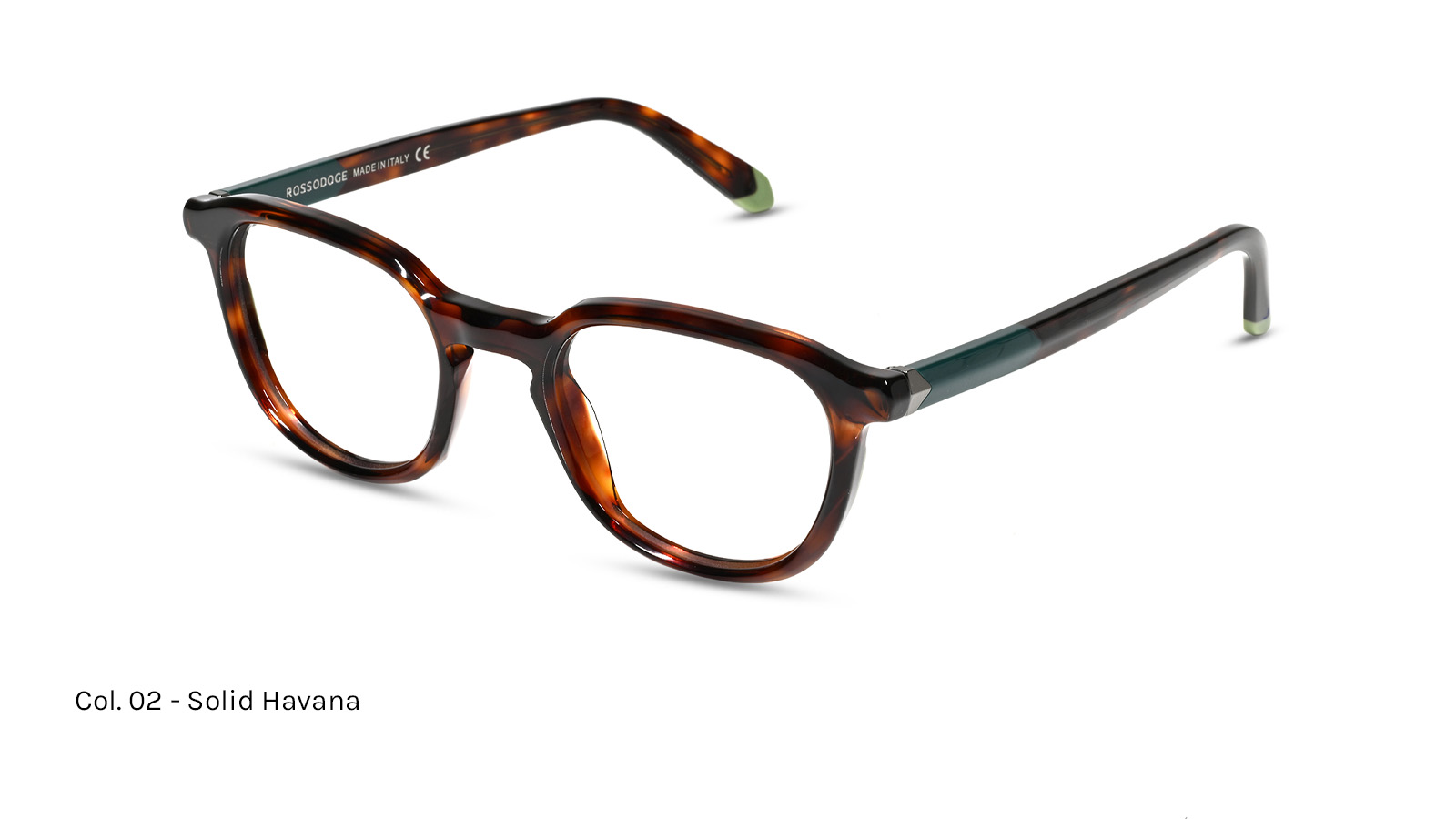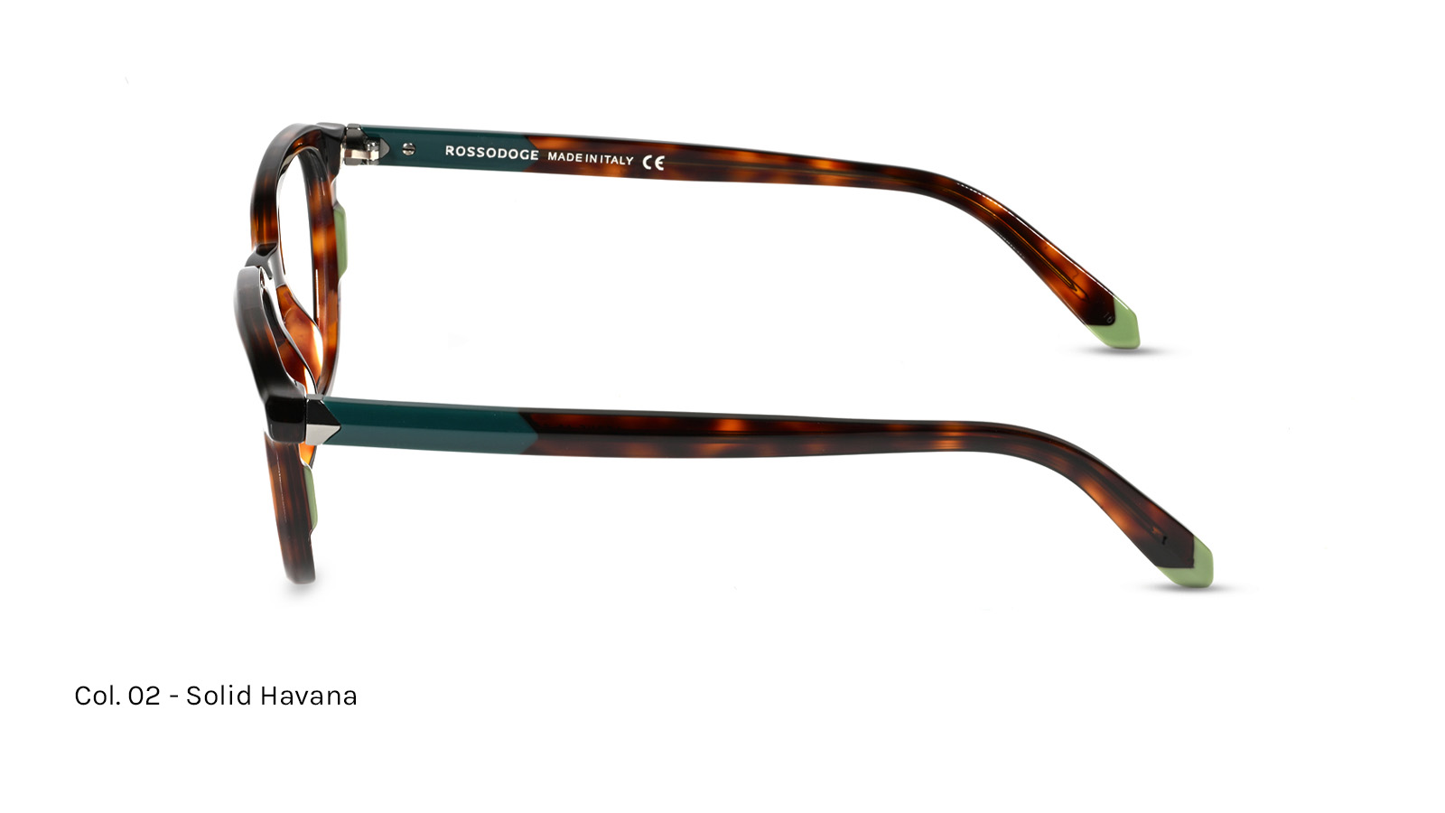 Laminazione di acetati in diverse colorazioni su frontale e aste, anima in acciaio, dettaglio in ottone sull'asta. Il particolare incollato sul frontale riprende il colore della parte finale del terminale in acetato.