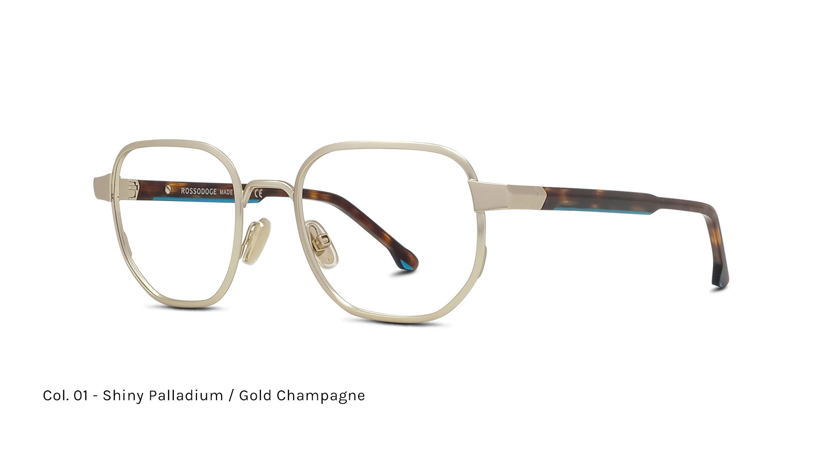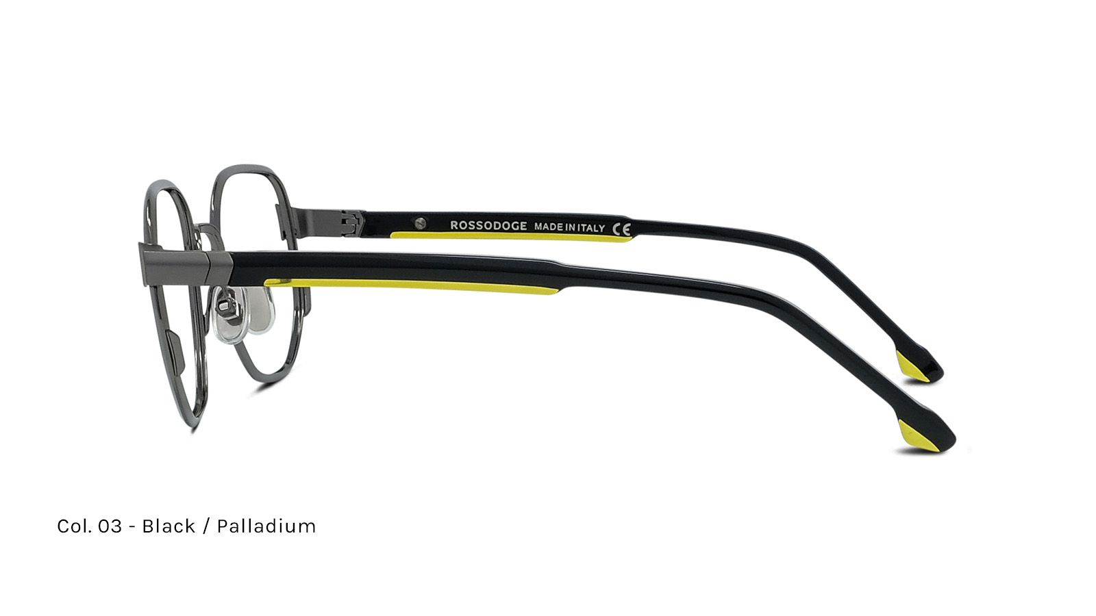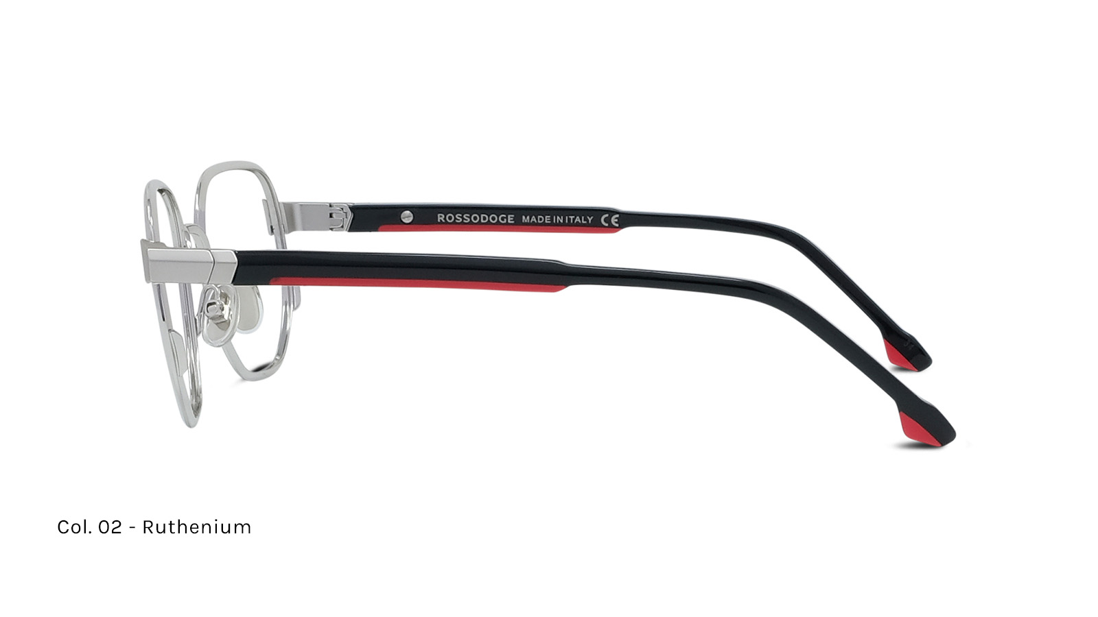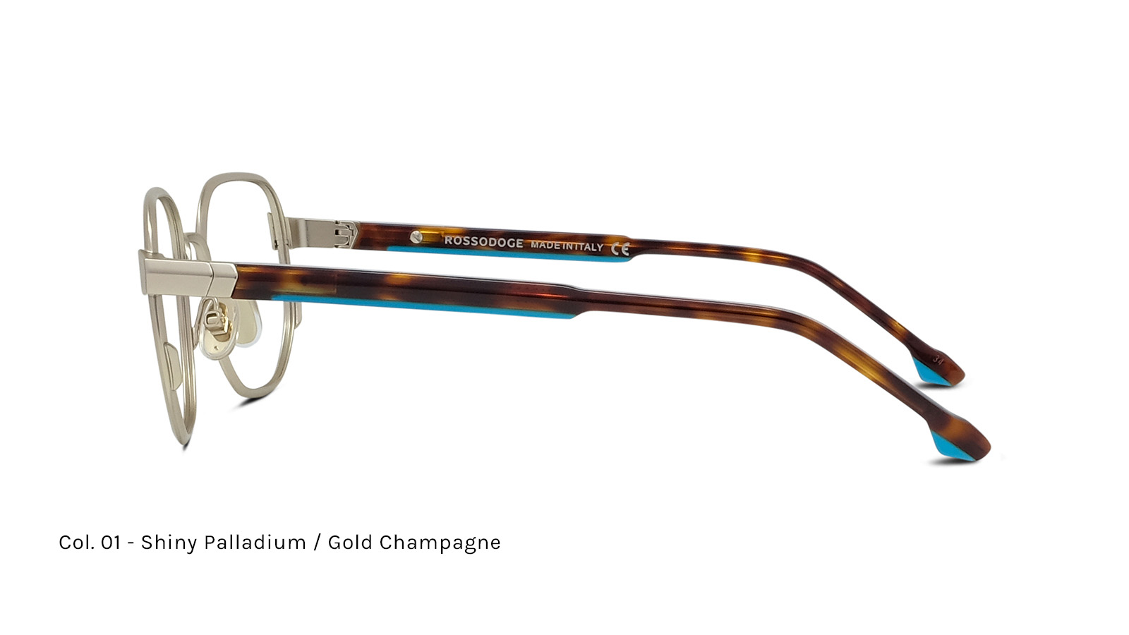 Frontale in metallo, aste con acetato laminato bicolore, anima in acciaio. Cerniera flex progettata per garantire il massimo comfort.