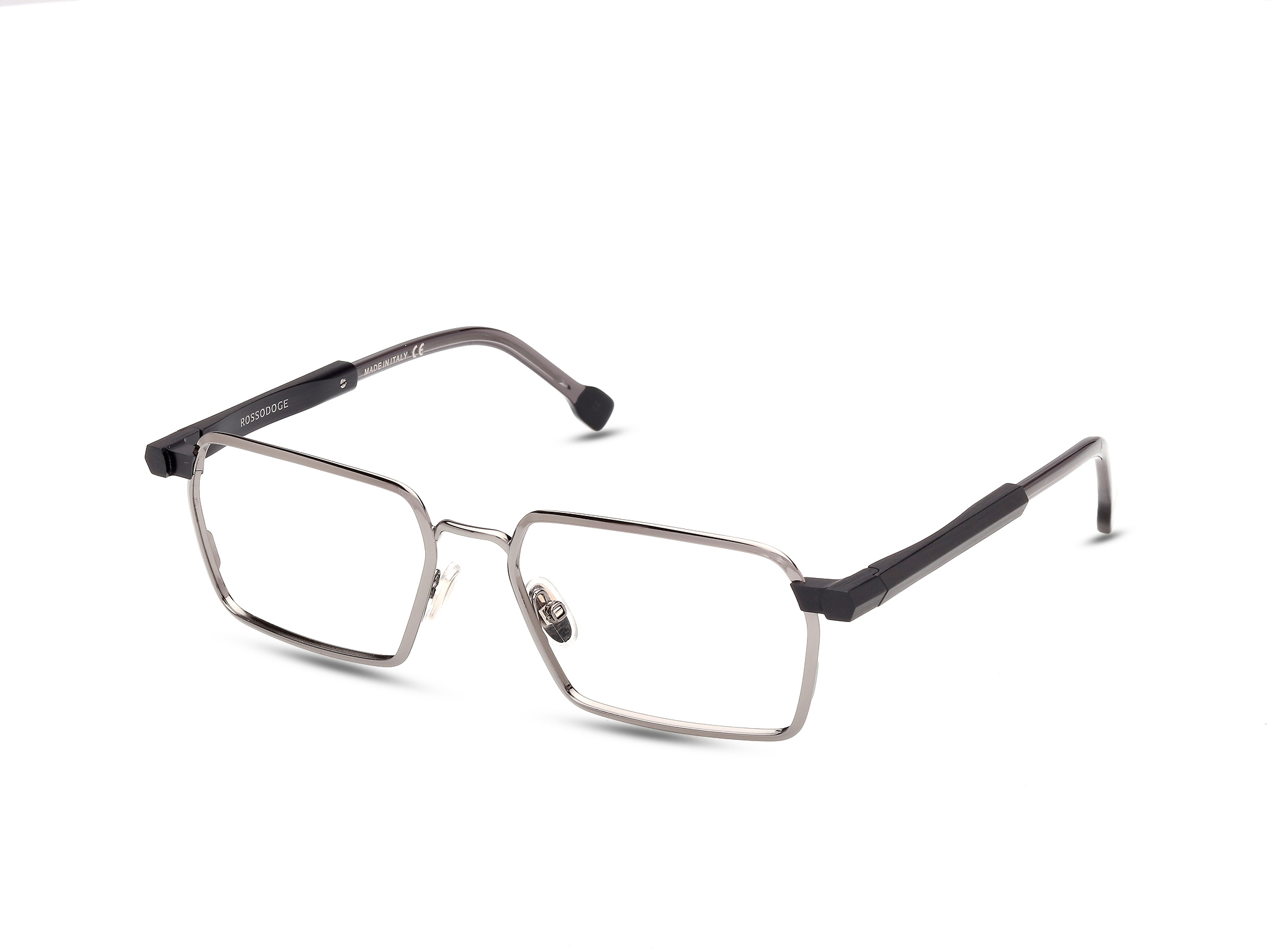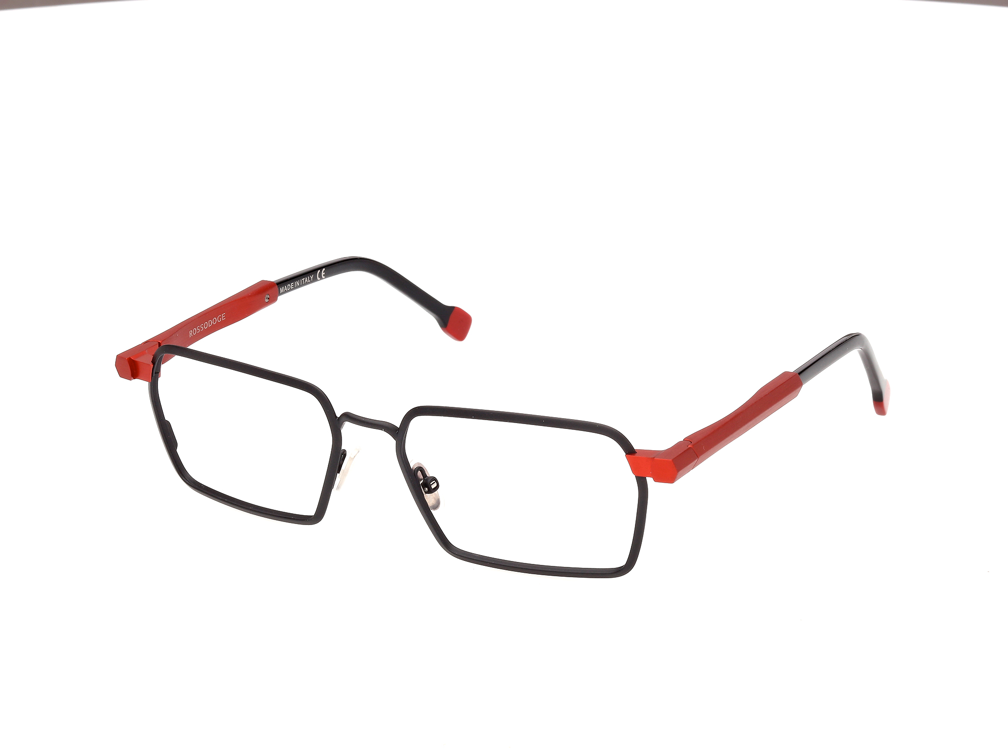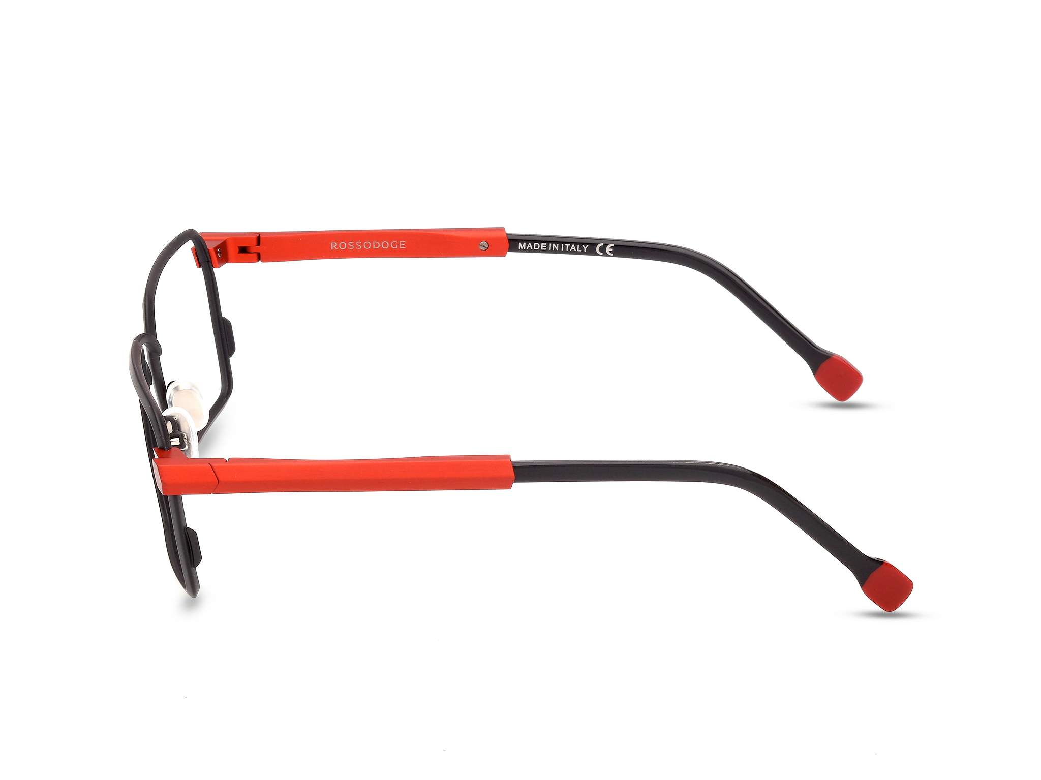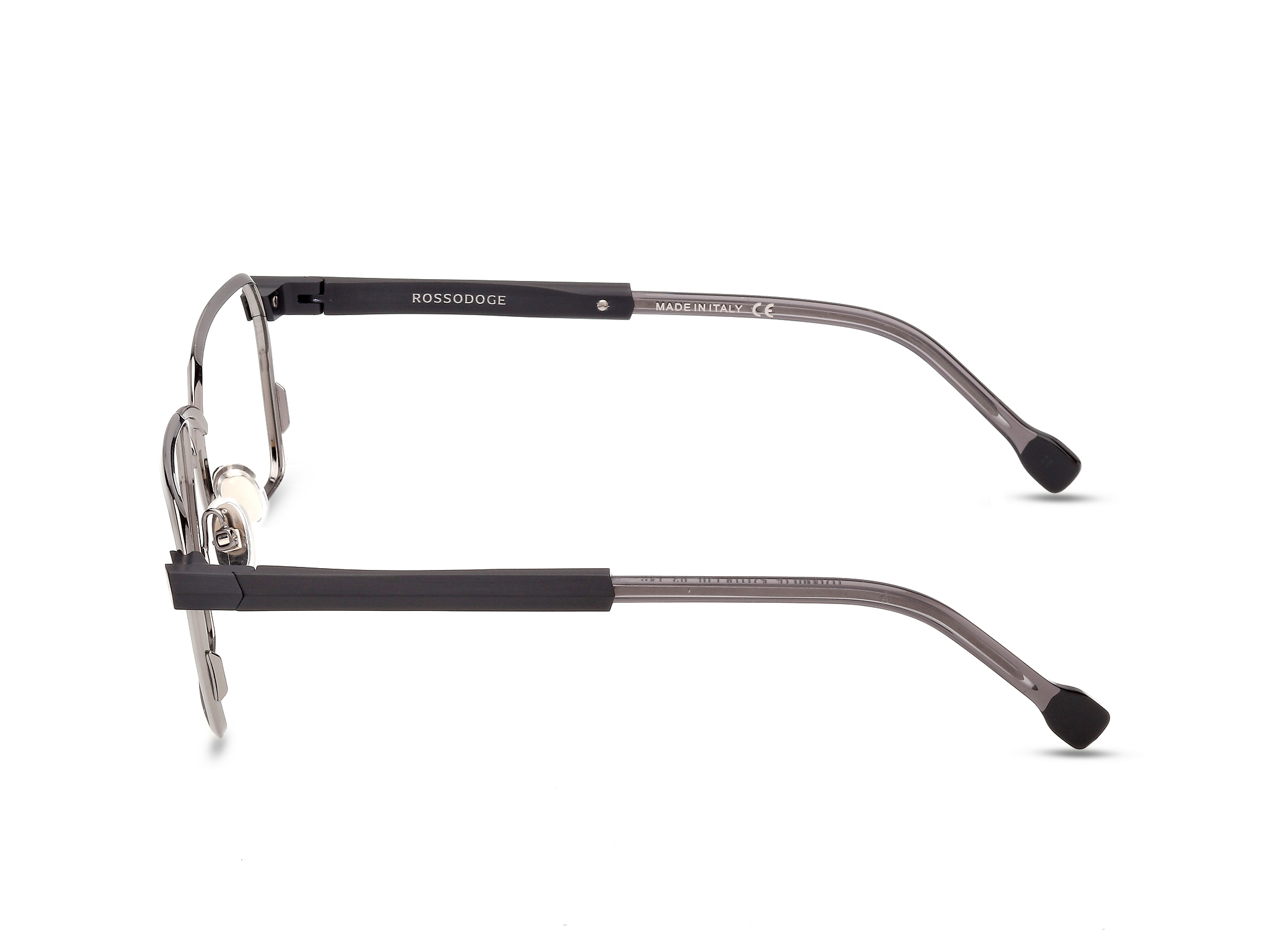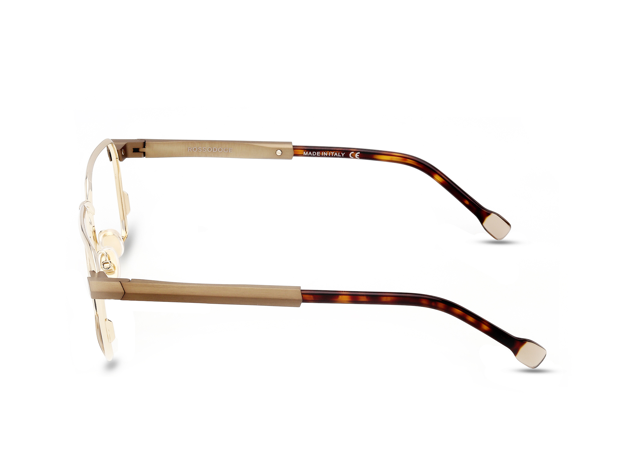 Frontale in metallo, aste con acetato laminato bicolore, musetto in alluminio, anima in acciaio. Aste e musetto con elemento in alluminio Ergal 7075 con finitura anodica satinata, più leggero e resistente.